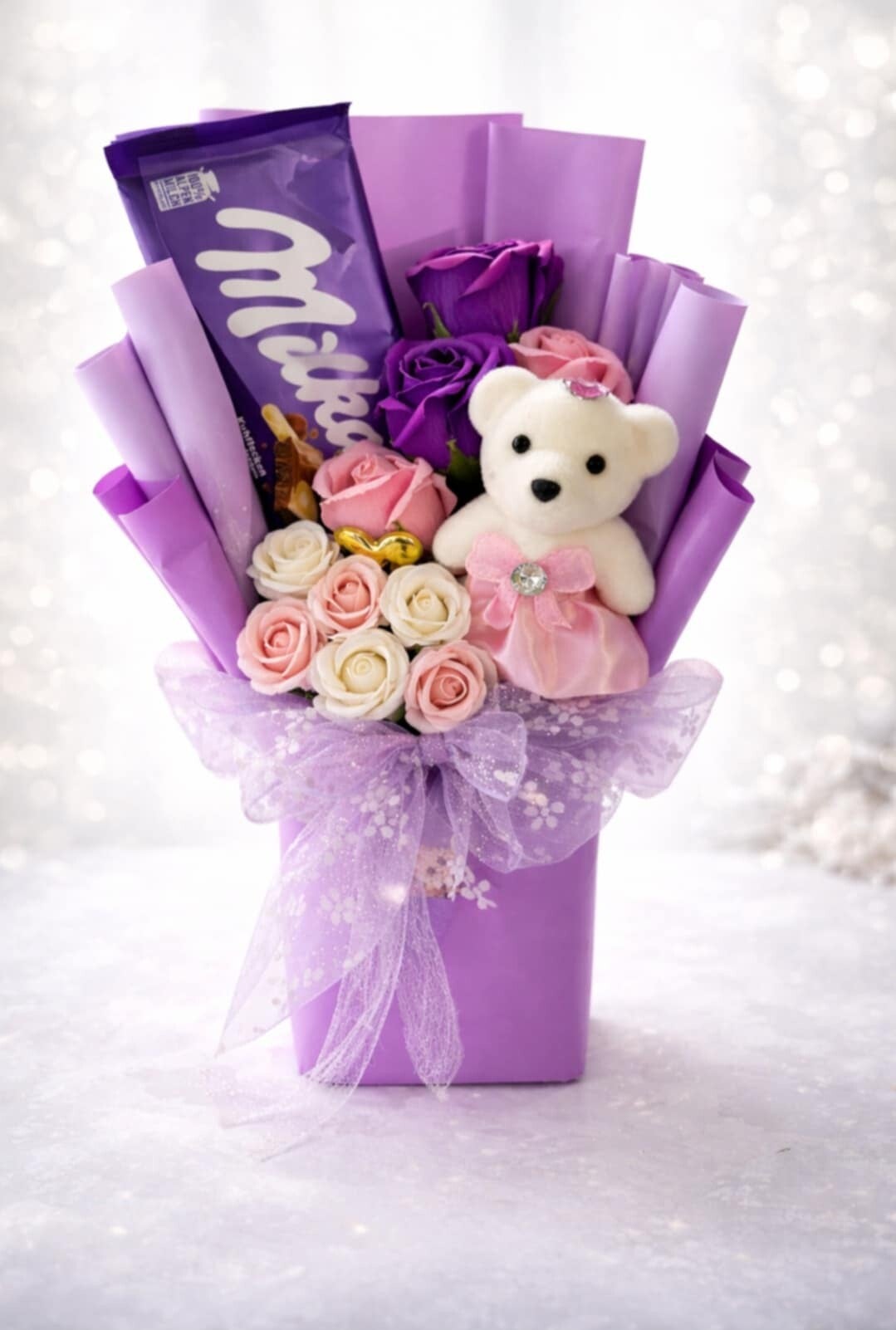 Wunderschöne Rosen, ein kleiner Teddybär, Milchschokolade – die Farben können in Wirklichkeit von den Fotos abweichen.