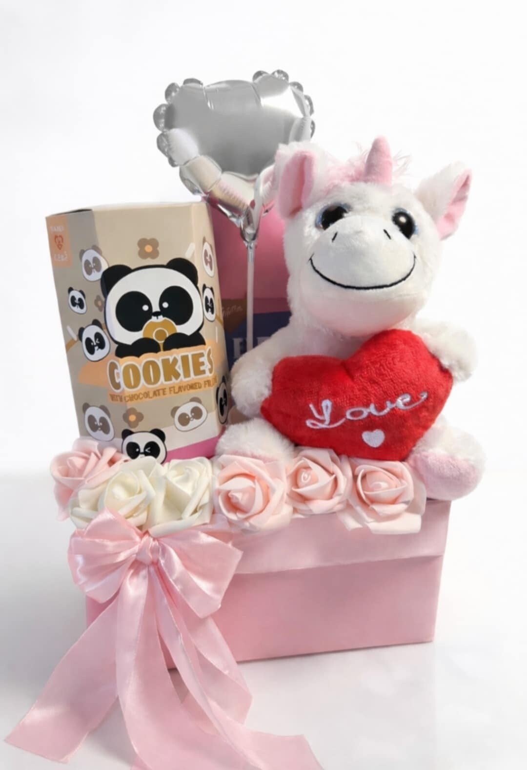 Geschenkbox mit Stofftier, Ballon, Süßigkeiten und Blumen H: 38 cm B: 30 cm Die tatsächlichen Farben können von den Abbildungen abweichen.